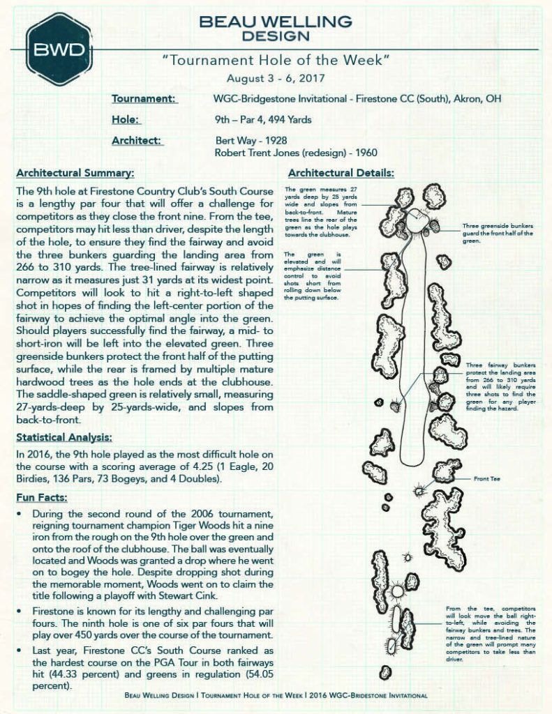The BWD Tournament Hole of the Week: August 3-6, 2017. The 9th at Firestone CC, Home of WGC-Bridgestone Invitational.