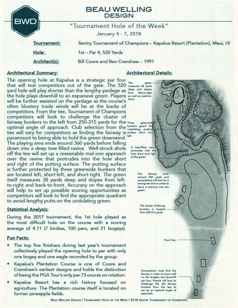 The BWD Tournament Hole of the Week: January 4 – 7, 2018. The 1st at Kapalua (Plantation), Home of Sentry Tournament of Champions.