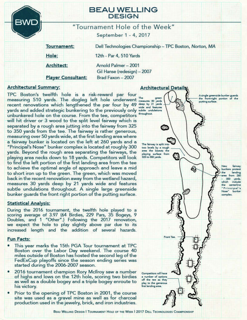 The BWD Tournament Hole of the Week: September 1 – 4, 2017. The 12th at TPC Boston, Home of Dell Technologies Championship.