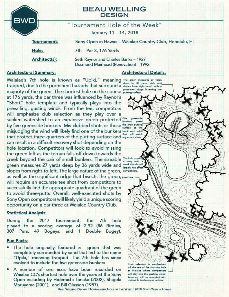 The BWD Tournament Hole of the Week: January 11 – 14, 2018. The 7th at Waialae Country Club, Home of Sony Open in Hawaii.