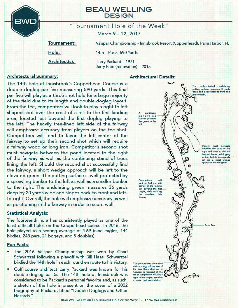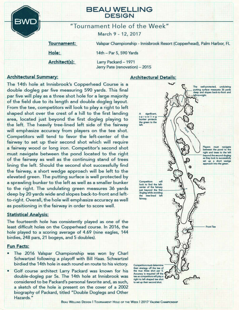 The BWD Tournament Hole of the Week: March 9 – 12, 2017. The 14th at Innisbrook Resort, Home of Valspar Championship.