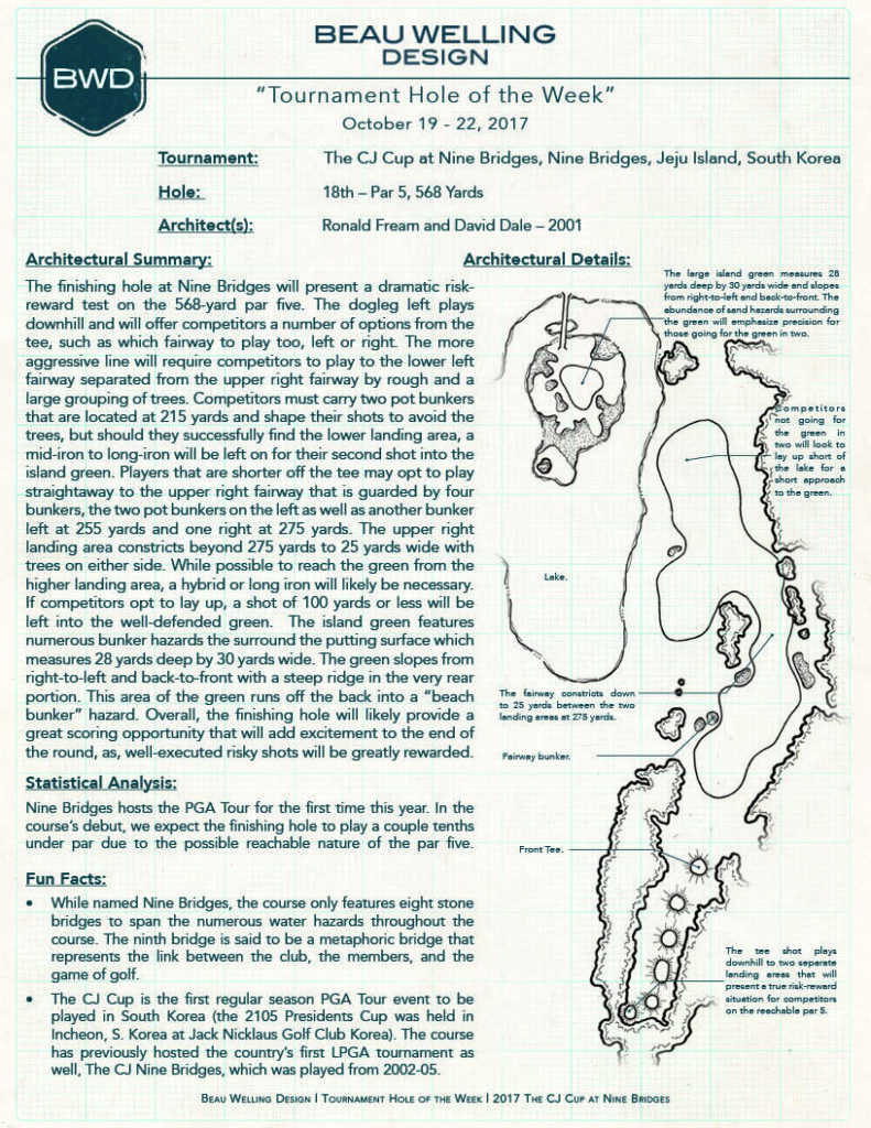 The BWD Tournament Hole of the Week: October 19 – 22, 2017. The 18th at Nine Bridges, Home of The CJ Cup at Nine Bridges.