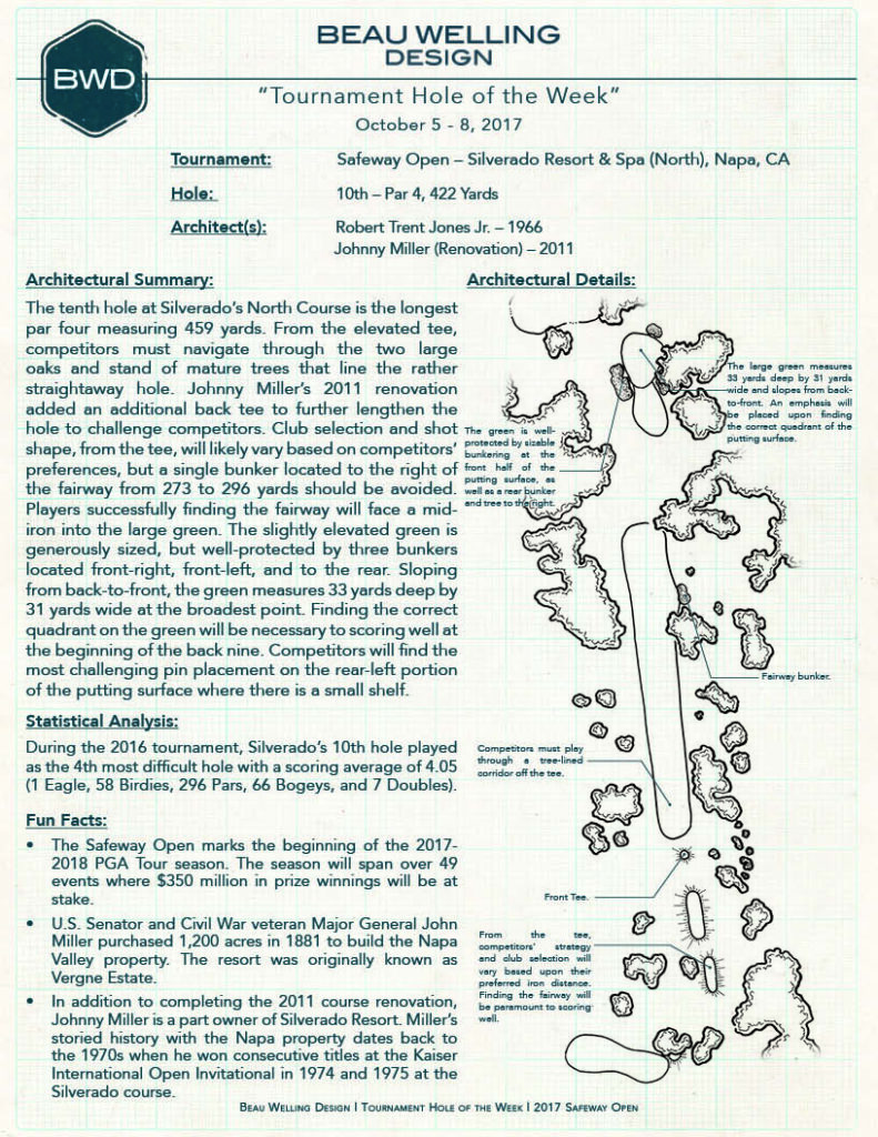 The BWD Tournament Hole of the Week: October 5 – 8, 2017. The 10th at Silverado Resort (North), Home of Safeway Open.